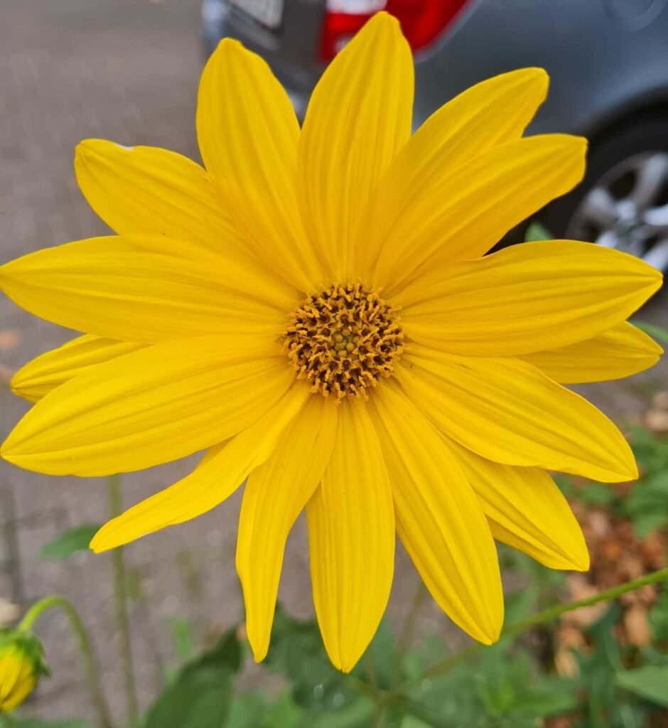 Wie diese Blume auf dem Asphalt können auch wir kraftvoll strahlen – selbst wenn um uns herum alles grau erscheint.